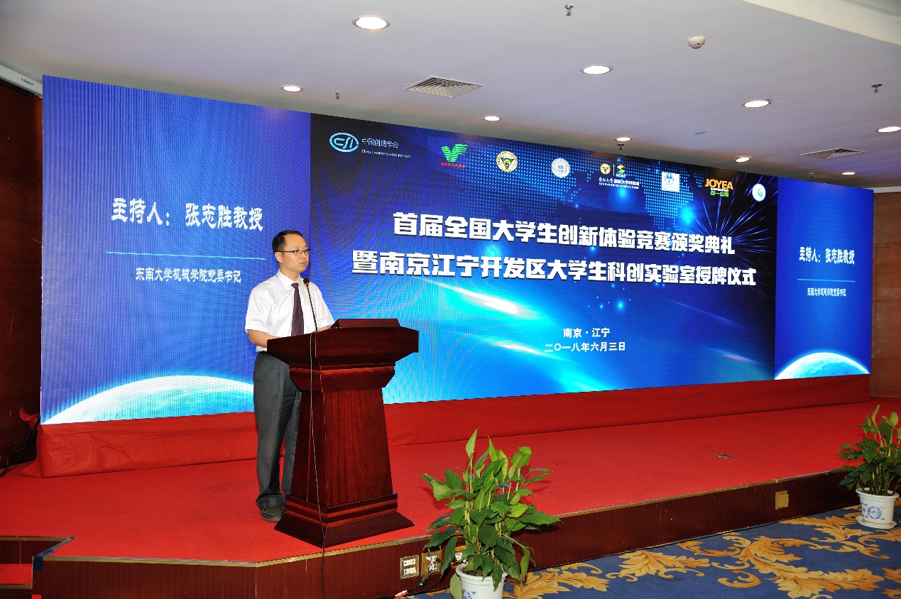 随后,6 月 3 日下午首届全国大学生创新体验竞赛颁奖典礼暨南京江宁开发区大学生科创实验室授牌仪式在东南大学九龙湖校区隆重举行,南京市领导、江宁区领导、东南大学领导出席活动并讲话。江宁开发区管委会、东南大学相关部处及院系、中国创造学会及相关单位的工作人员等近 300 人参加了活动。本次活动分为首届全国大学生创新体验竞赛颁奖及南京江宁开发区大学生科创实验室授牌两个环节,分别由米兰平台党委书记张志胜和南京江宁开发区科技人才局局长张洋主持。东南大学副校长吴刚教授,南京市科委副主任陈为生,中国创造学会常务副理事长兼秘书长张亚雷教授等嘉宾出席了本次活动。