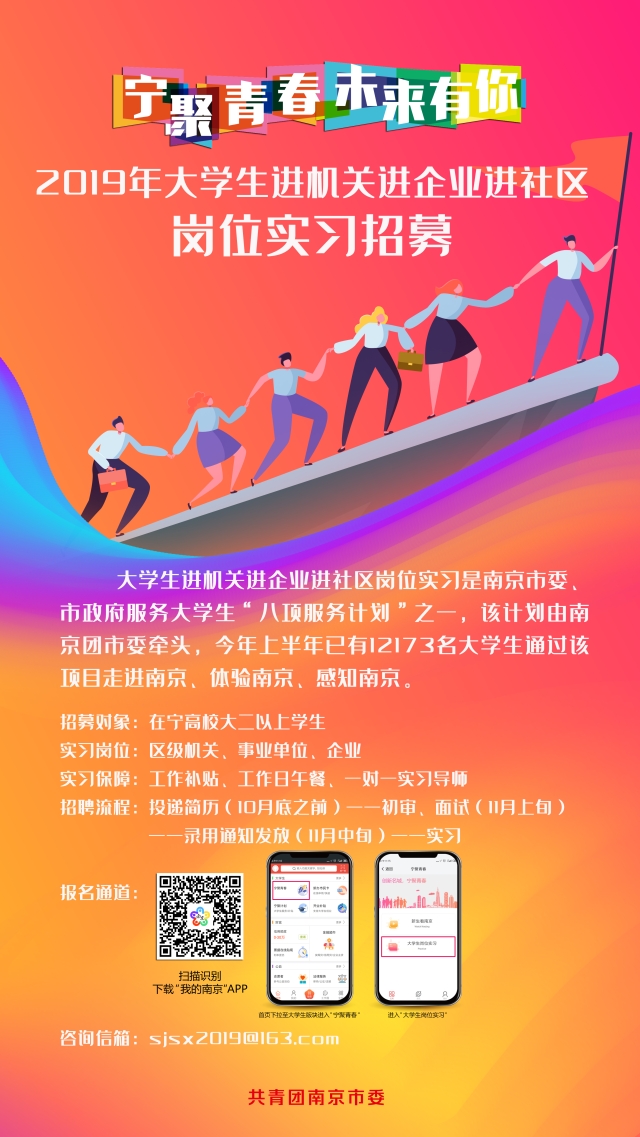 作为南京市“宁聚青春”计划的重要内容——大学生“三进”实习项目已全年常态化开展,现面向学校大二及以上学生提供区级机关、事业单位和企业的实习岗位,实习具体时间可根据课余时间与用人单位协调。请有意向的同学须在10月底前线上报名,报名方式请见下图。