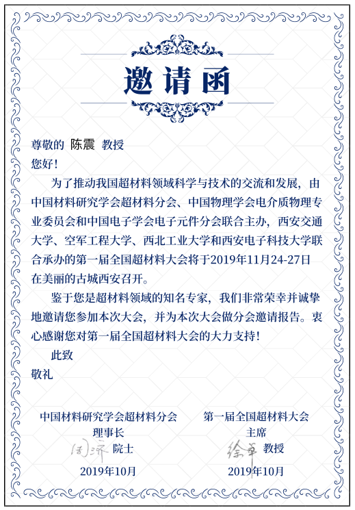 第一届全国超材料大会于2019年11月24 ~ 27日在美丽古都西安召开,米兰平台的陈震教授受邀参加大会并作特邀报告。