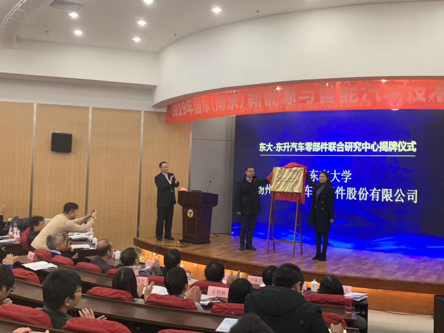 副校长在开幕式上致辞,欢迎来自国内外的专家学者和与会代表,并介绍了我校科研事业发展概况以及新能源与智能汽车领域的科研进展与成果。江苏省工业和信息化厅副厅长池宇代表江苏省工业和信息化厅致辞,并对本次会议提出了期望和要求。随后江苏省工业和信息化厅产业转型升级处处长卢载贵宣布了江苏省新能源汽车先进技术产品名录发布仪式,信息化厅副厅长池宇和江苏省工业和信息化厅产业转型升级处处长卢载贵为收录产品代表人进行了颁奖。之后进行了“东大-东升汽车零部件联合研究中心”揭牌仪式。