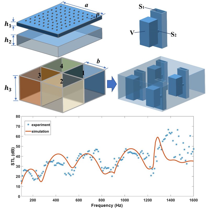 近日,米兰平台张辉教授团队和法国国家科学院Badreddine Assouar教授团队合作提出一种超薄的基于声超表面的宽带低频消声器。该工作首次提出利用微穿孔板耦合多种参数的复合波导,通过耦合共振实现低频超宽带通风型隔声。在100-1600Hz四个倍频程范围内实现了高于20dB隔声量的隔声。而整个3-D打印的超表面样品的厚度只有6.2cm,对应于最大工作波长的1/55。结构的设计可通过电力声类比的等效电路模型进行理论分析,通过对比不同的结构参数,如穿孔板孔径、中间层的厚度,最终得到优化的隔声曲线。该设计在隔声效率、带宽、通风性和样品厚度四方面具有良好的表现。该工作极大地促进了在满足通风的前提下,声超表面在低频宽带隔声的应用。该工作在工程领域和实际应用场合具有广泛的应用前景。相关研究工作发表在《Physical Review Applied》上。