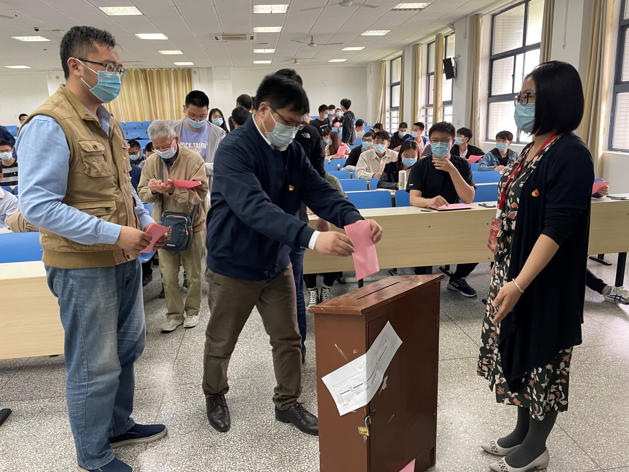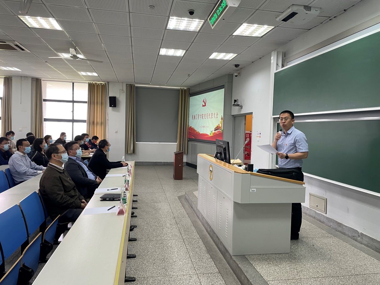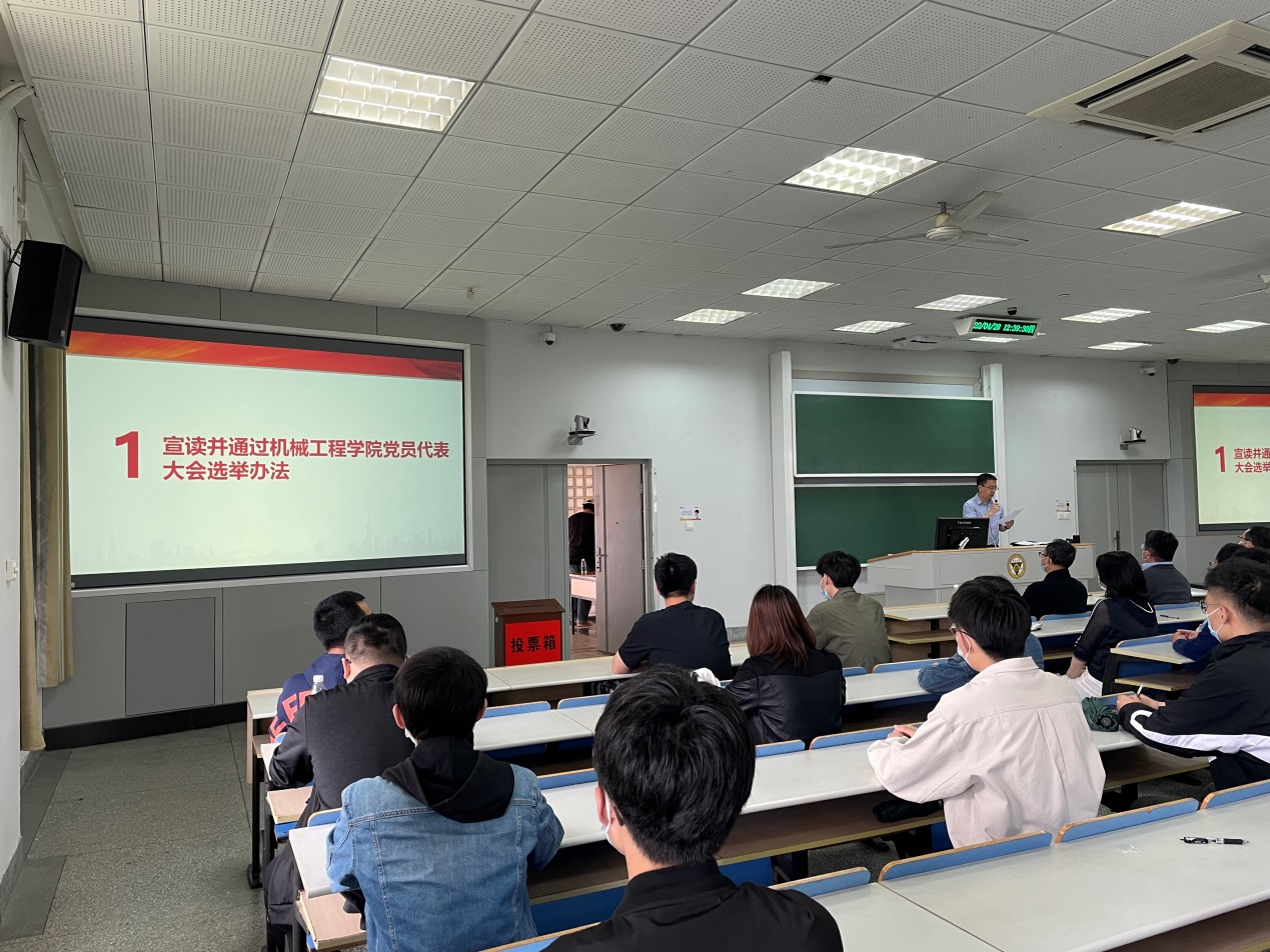 会议在全体齐唱《中华人民共和国国歌》中拉开了帷幕。王斌书记首先介绍了大会议程,并宣读选举办法,经全体与会党员举手表决,全票通过了选举工作办法。大会提议并通过了机械工程学院工会主席吴泽同志担任总监票人,闫焱、苏铭、李永哲、张慧同志担任监票人,杨杰、袁华隆、黄炜驰、王舒然、景健、叶延伟、蔡瑞荣、王军飛同志担任计票人。