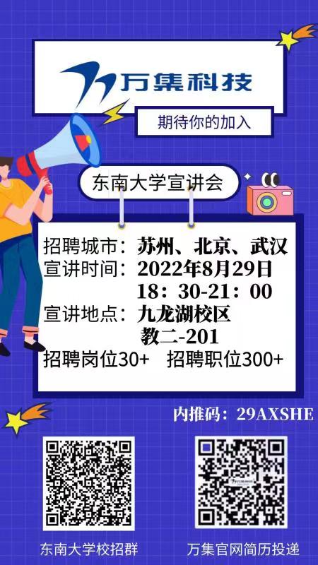 万集科技将在8月29日(今晚周一)6点30在九龙湖校区教二-201举行宣讲会,欢迎大家到场观看!我们现场会发放准备的精美!同时也将现场收简历!大家可以呼朋唤友一起过来了解一下啦~