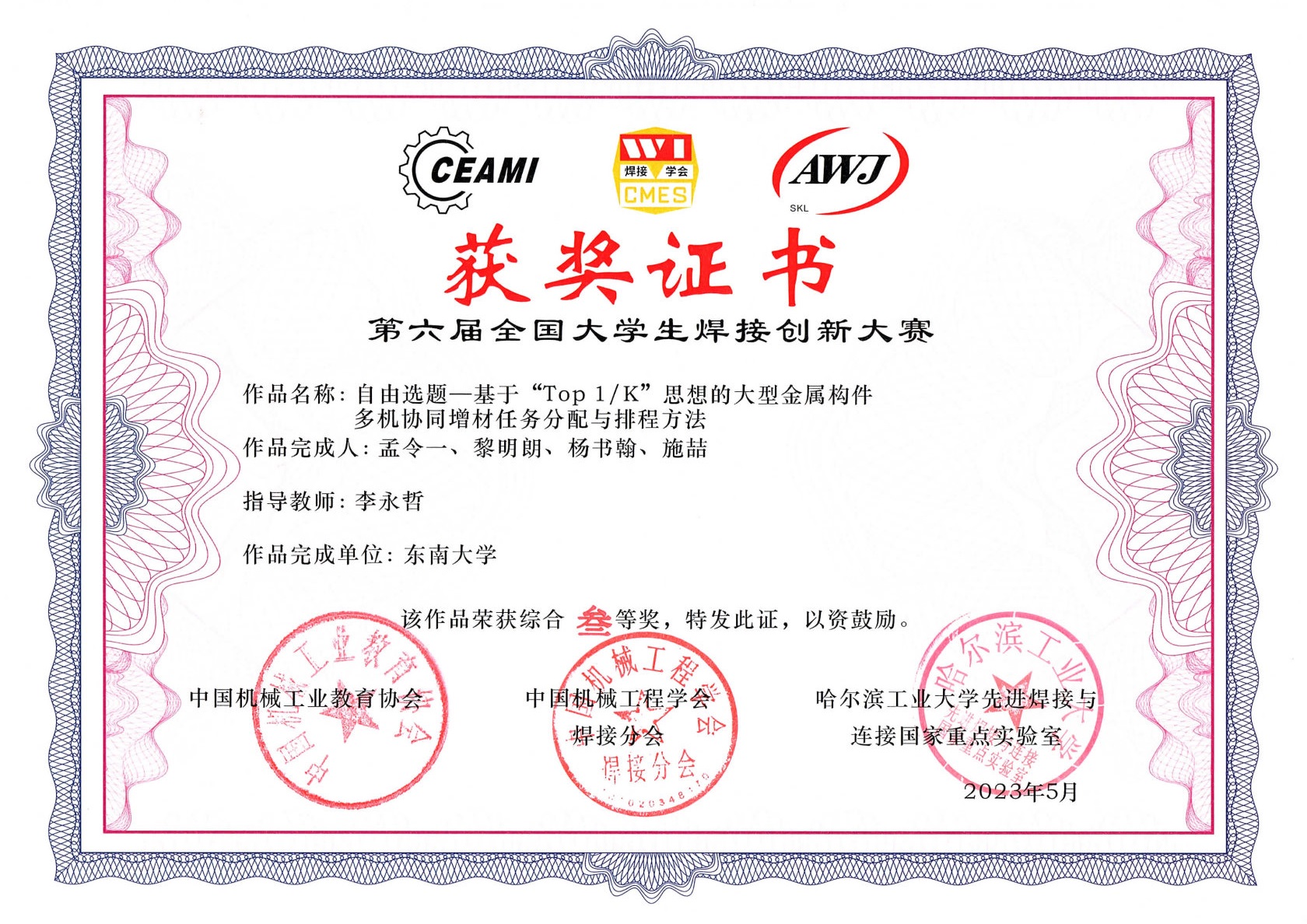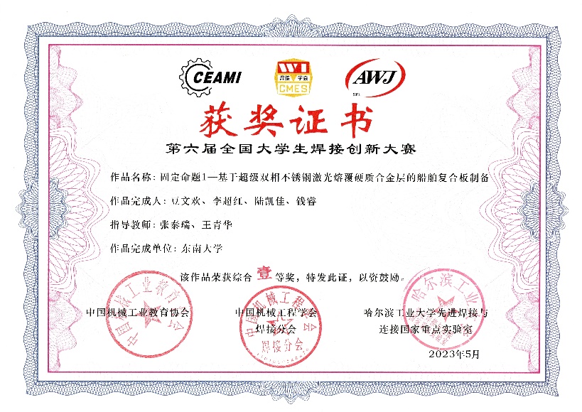 在学校教务处、机械工程学院的大力支持下,本届大赛东南大学代表队由刘小超副教授、李永哲副教授带队,刘小超副教授受邀担任自由命题组评委。经过紧张激烈的比赛,我校由张泰瑞、王青华老师指导,豆文欢、李超红、陆凯佳、钱睿4位同学完成的项目《基于超级双相不锈钢激光熔覆硬质合金层的船舶复合板制备》获固定命题一等奖;由刘小超老师指导,罗璟玥、万宇、包文辉、李瑞茹4位同学完成的项目《基于搅拌-涡流-机械互锁的复合摩擦焊界面的金属异质构件增材制造技术研究》获自由命题二等奖;由李永哲老师指导,孟令一、黎明朗、杨书翰、施喆4位同学完成的项目《基于“Top 1/K”思想的大型金属构件多机协同增材任务分配与排程方法》、由裴宪军老师指导,张龙怀、蔡路、王郑、杨宇轩4位同学完成的项目《抗屈曲纤焊复合结构设计》分别获得自由命题和固定命题三等奖。