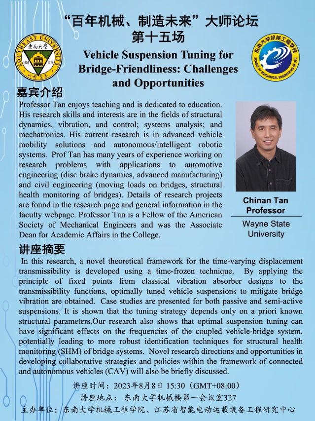 Professor Tan enjoys teaching and is dedicated to education. His research skills and interests are in the fields of structural dynamics, vibration, and control; systems analysis; and mechatronics. His current research is in advanced vehicle mobility solutions and autonomous/intelligent robotic systems. Prof Tan has many years of experience working on research problems with applications to automotive engineering (disc brake dynamics, advanced manufacturing) and civil engineering (moving loads on bridges, structural health monitoring of bridges). Details of research projects are found in the research page and general information in the faculty webpage. Professor Tan is a Fellow of the American Society of Mechanical Engineers and was the Associate Dean for Academic Affairs in the College.