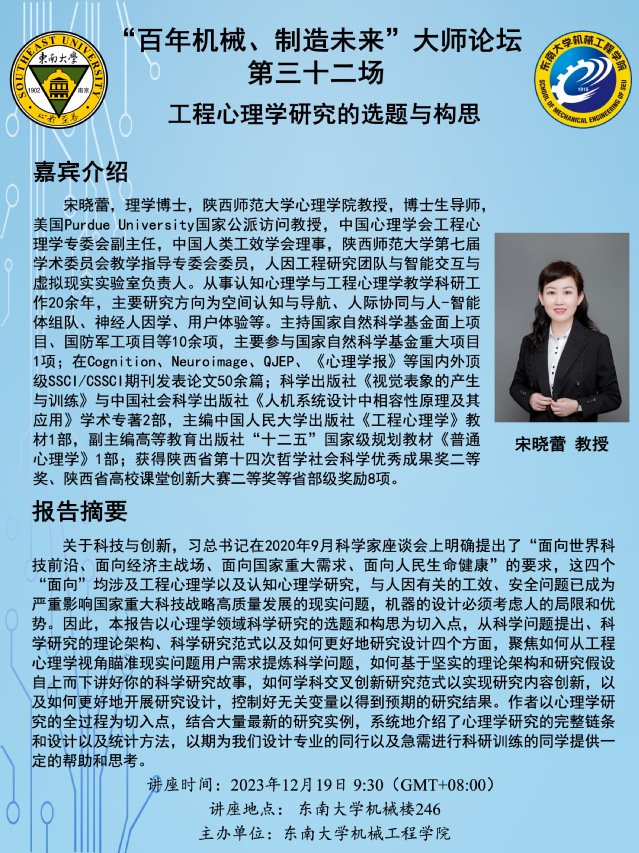 宋晓蕾,理学博士,陕西师范大学心理学院教授,博士生导师,美国Purdue University国家公派访问教授,中国心理学会工程心理学专委会副主任,中国人类工效学会理事,陕西师范大学第七届学术委员会教学指导专委会委员,人因工程研究团队与智能交互与虚拟现实实验室负责人。从事认知心理学与工程心理学教学科研工作20余年,主要研究方向为空间认知与导航、人际协同与人-智能体组队、神经人因学、用户体验等。主持国家自然科学基金面上项目、国防军工项目等10余项,主要参与国家自然科学基金重大项目1项;在Cognition、Neuroimage、QJEP、《心理学报》等国内外顶级SSCI/CSSCI期刊发表论文50余篇;科学出版社《视觉表象的产生与训练》与中国社会科学出版社《人机系统设计中相容性原理及其应用》学术专著2部,主编中国人民大学出版社《工程心理学》教材1部,副主编高等教育出版社“十二五”国家级规划教材《普通心理学》1部;获得陕西省第十四次哲学社会科学优秀成果奖二等奖、陕西省高校课堂创新大赛二等奖等省部级奖励8项。