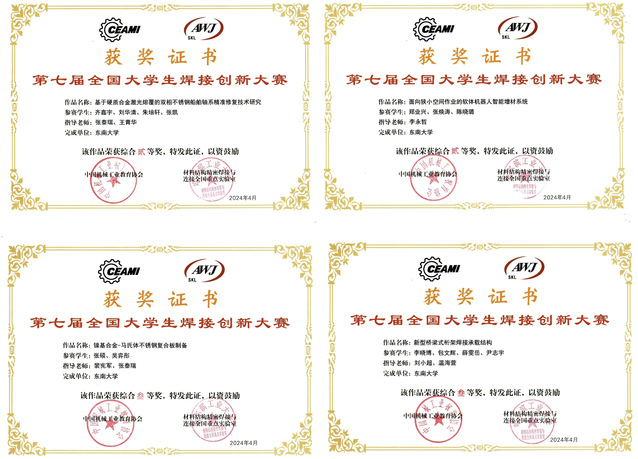 在学校教务处、机械工程学院的大力支持下,本届大赛全国决赛的东南大学代表队由张泰瑞老师带队参加,并受邀担任固定命题组评委。经过紧张激烈的比赛,我校由张泰瑞、王青华两位老师指导,齐文鑫、朱培轩、刘华清、张凯4位同学的项目《基于硬质合金激光熔覆的双向不锈钢船舶轴系精准修复技术研究》获固定命题二等奖;由李永哲老师指导,郑业兴、张焕涛、陈晓璐3位同学的项目《面向狭小空间作业的软体机器人智能增材系统》获自由命题二等奖;由刘小超、温海营老师指导,李晓博、包文辉、薛雯岳、尹志宇4位同学的项目《新型桥梁式桁架焊接承载结构》;由裴宪军、张泰瑞老师指导,张硕、吴奕彤2位同学的项目《镍基合金-马氏体不锈钢复合板制备》获得固定命题三等奖。