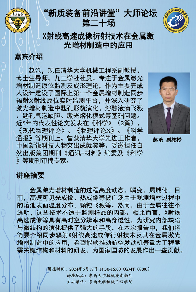 “新质装备前沿讲堂”第二十场:赵沧教授——X射线高速成像衍射技术在金属激光增材制造中的应用