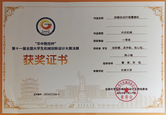 717日,华中数控杯第十一届全国大学生机械创新设计大赛决赛在华中科技大学落下帷幕。机械学子宋昕蓉、吴宇航、张心钰和陈小楷组成的参赛队伍,在章寅和苏铭老师的指导下,凭借《拱棚自动扦插覆膜机》作品喜获全国一等奖(最高奖)!王郑、豆文欢、杜煜成和王子阳同学在王玉娟和毕可东老师指导下完成的《蝴蝶东南飞》作品获得全国三等奖。