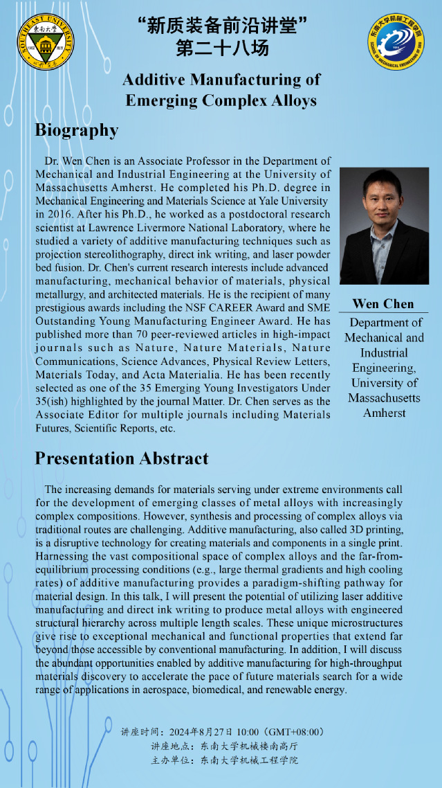 Dr. Wen Chen is an Associate Professor in the Department ofMechanical and Industrial Engineering at the University of Massachusetts Amherst. He completed his Ph.D. degree irMechanical Engineering and Materials Science at Yale Universityin 2016.After his Ph.D., he worked as a postdoctoral researclscientist at Lawrence Livermore National Laboratory, where hestudied a variety of additive manufacturing technigues such asprojection stereolithography, direct ink writing, and laser powdebed fusion. Dr. Chen's current research interests include advancedmanufacturing,mechanical behavior ofmaterials, physicalmetallurgy, and architected materials. Hle is the recipient of manvprestigious awards including the NSF CAREER Award and SMEOutstanding Young Manufacturing Engineer Award. He haspublished more than 70 peer-reviewed articles in high-impactiournals such as Nature,Nature Materials,NatureCommunications,Science Advances, Physical Review LettersMaterials Today, and Acta Materialia. He has been recentlselected as one of the 35 Emerging Young Investigators Under35(ish) highlighted by the journal Matter. Dr. Chen serves as theAssociate Editor for multiple iournals including MaterialsFutures,Scientific Reports, etc.