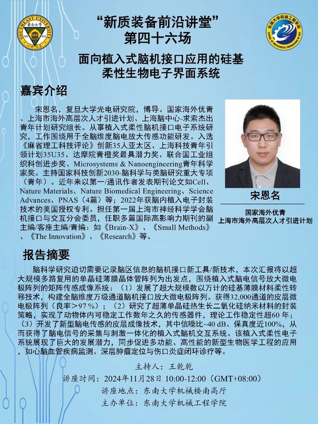 “新质装备前沿讲堂”第四十六场:宋恩名优青——面向植入式脑机接口应用的硅基柔性生物电子界面系统