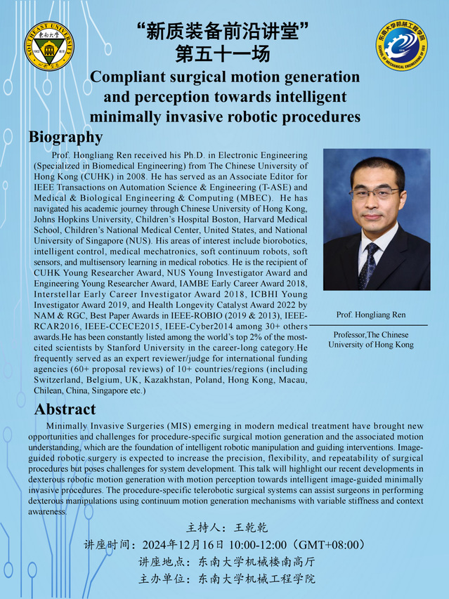 “新质装备前沿讲堂”第五十一场:Prof.Hongliang Ren——Compliant surgical motion generation and perception towards intelligent minimally invasive robotic procedures