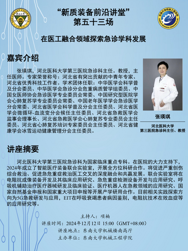 2024年12月12日,由米兰平台主办的“新质装备前沿讲堂”第五十三场在东南大学机械楼南高厅成功举办。本次活动特别邀请了河北医科大学第三医院急诊科主任张瑛琪教授作为主讲嘉宾,开展了关于“在医工融合领域急诊学科发展”的学术报告。报告会由项楠老师主持,河北医科大学第三医院急诊科副主任李梅、南京航空航天大学姚佳烽老师、朱桂平老师、刘凯老师共同出席了本次活动。