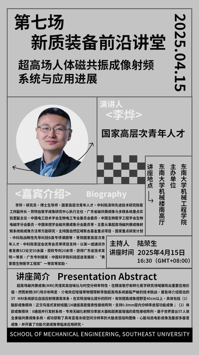 2025年机械学院“新质装备前沿讲堂”第七场:李烨研究员——超高场人体磁共振成像射频系统与应用进展
