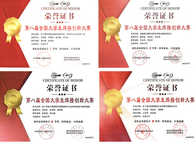 2025年5月16日至18日,第八届全国大学生焊接创新大赛在西北工业大学举行。本届大赛东南大学共派出4支队伍参赛,最终获得一等奖1项、二等奖2项、三等奖1项,取得历年参赛最佳成绩。