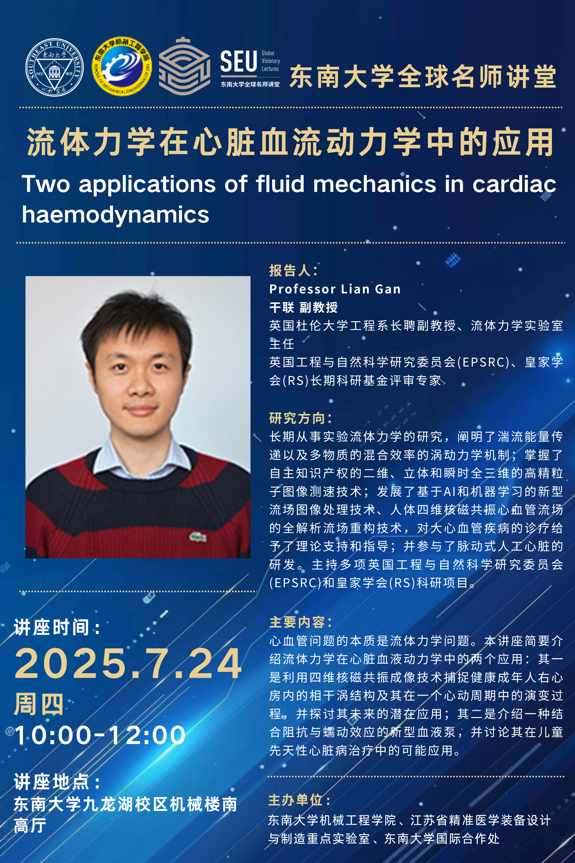 2025年机械学院“新质装备前沿讲堂”第二十一场:Prof. Lian Gan——流体力学在心脏血流动力学中的应用