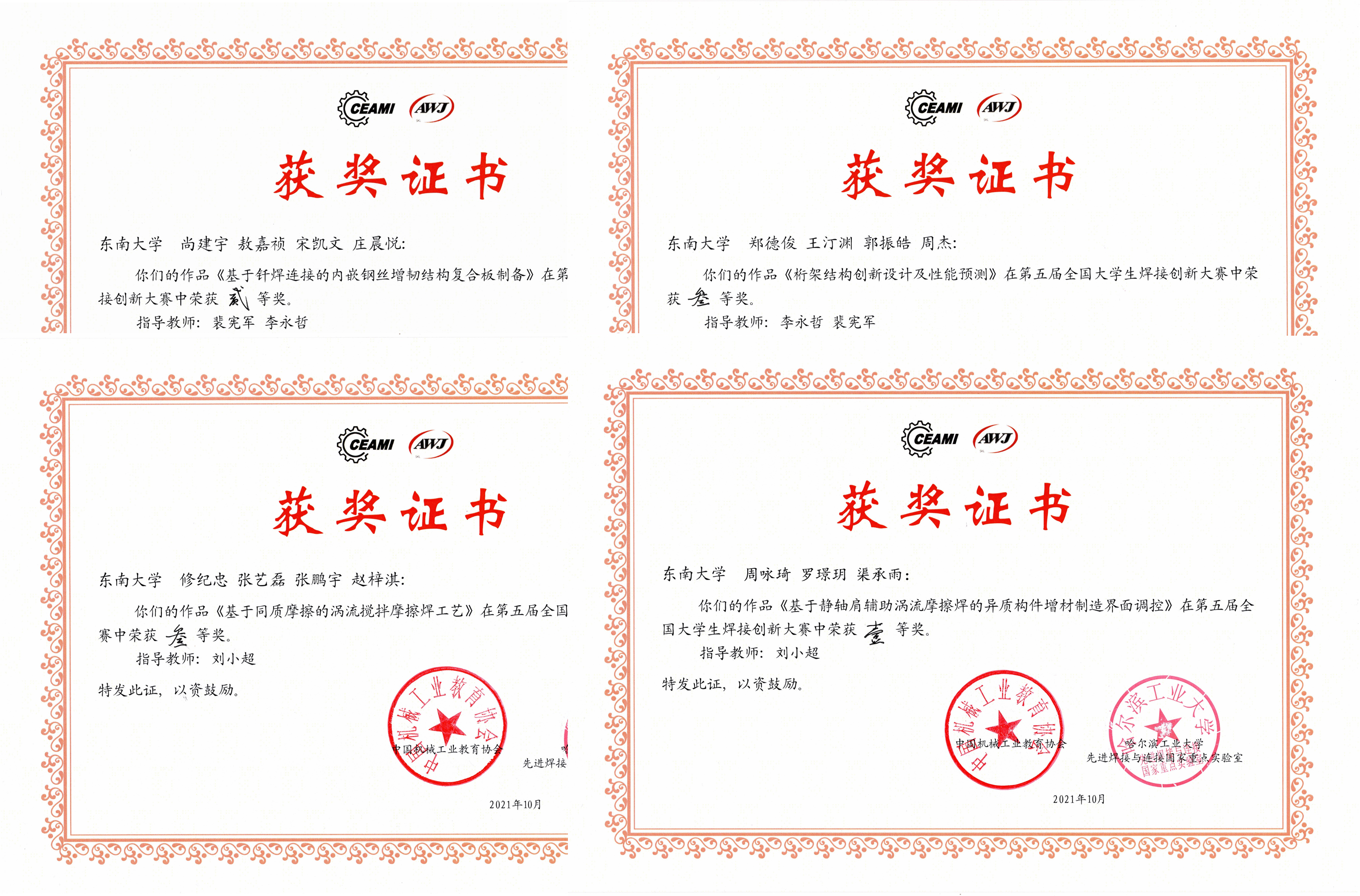 20211020-23日第五届全国大学生焊接创新大赛决赛在哈尔滨工业大学举行,本次大赛共有来自哈尔滨工业大学、清华大学、东南大学、天津大学、西北工业大学、吉林大学、中南大学等62所高校的220件作品参加决赛,我校首次组织队伍参赛,并最终获得一等奖1项、二等奖1项、三等奖2项的优异成绩。