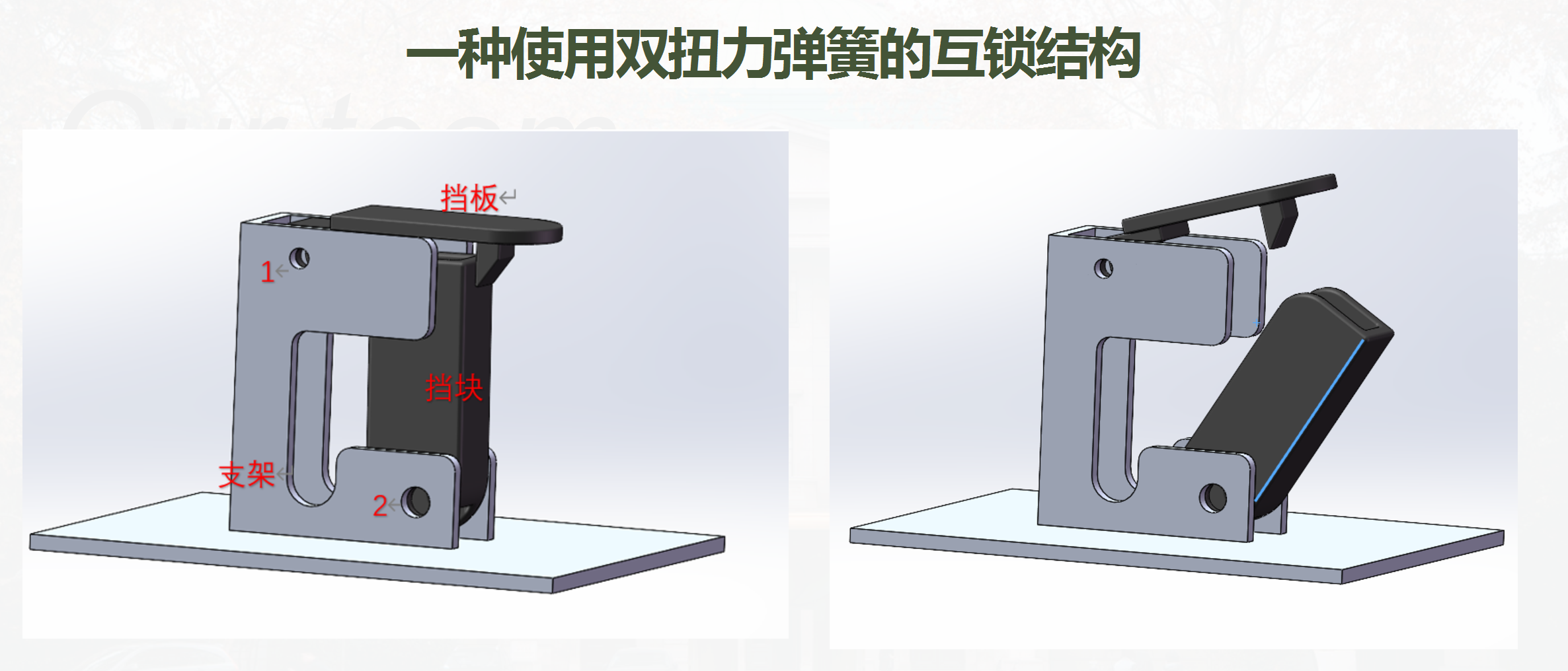 通过连杆左右摆动带动圆柱滚体在弹簧轨道左右运功,挤压弹簧产生受力用于复位。该机构的优点是原理简单,结构灵巧,不足之处是